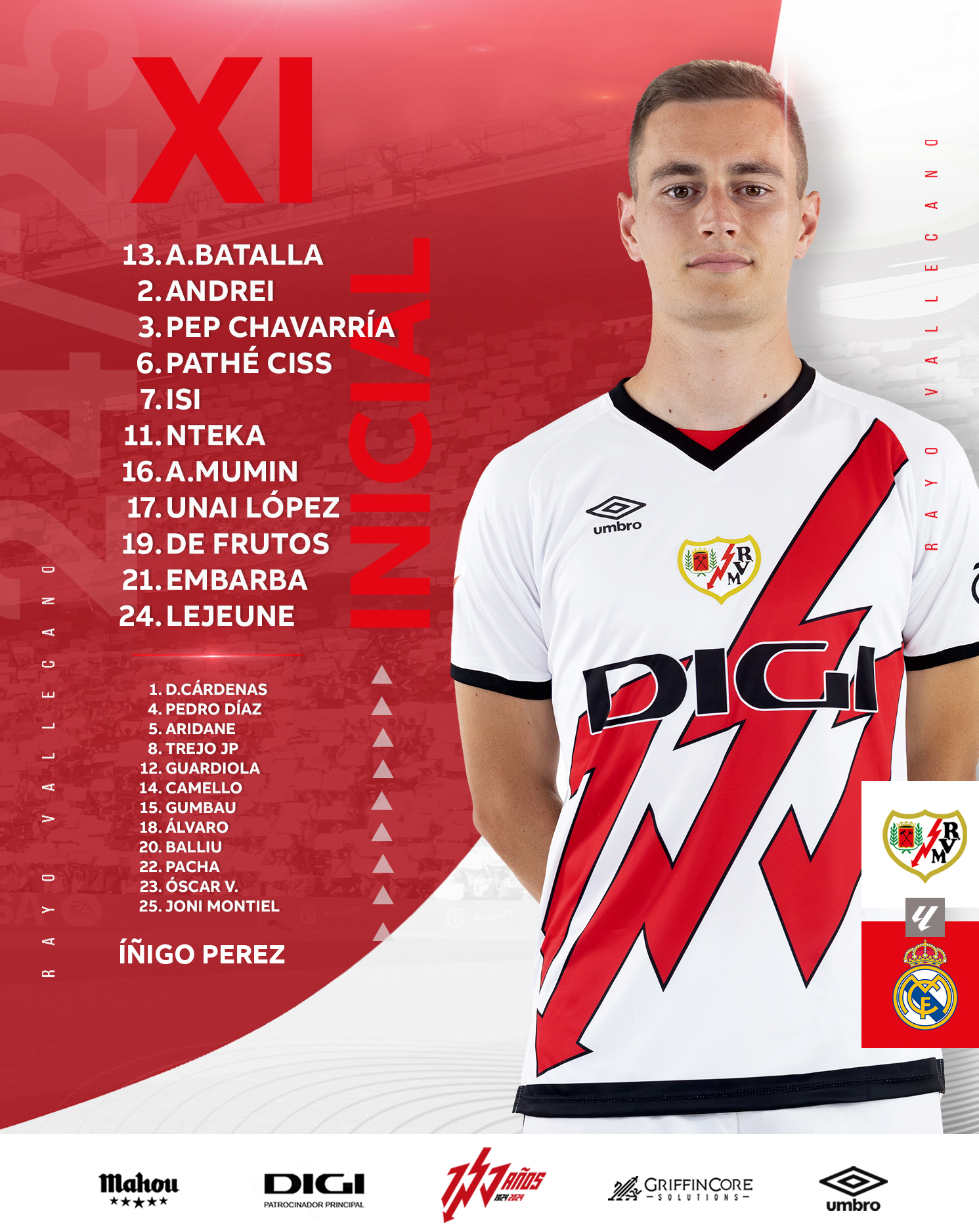 Pro utkání s Rayem byli povoláni také hráči z akademie – Sergio Mestre (brankář), Youssef (obránce), Lorenzo Aguado (obránce) a Víctor Muñoz.