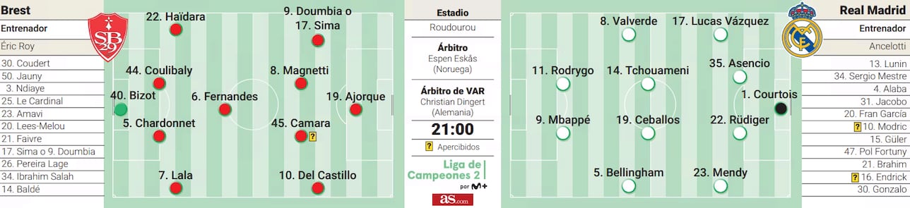 Carlo Ancelotti se dnes vrátil ke konzervativnímu rozestavení, kdy na pravý kraj obrany postavil Lucase Vázqueze, vedle něj nasadil Auréliena Tchouaméniho. V záloze tentokrát místo Ceballose dostal příležitost Modrić. Další změna nastala v ofenzivním trojzubci, kde se vedle Rodryga a Mbappého místo vykartovaného Viníciuse postavil Brahim Díaz.